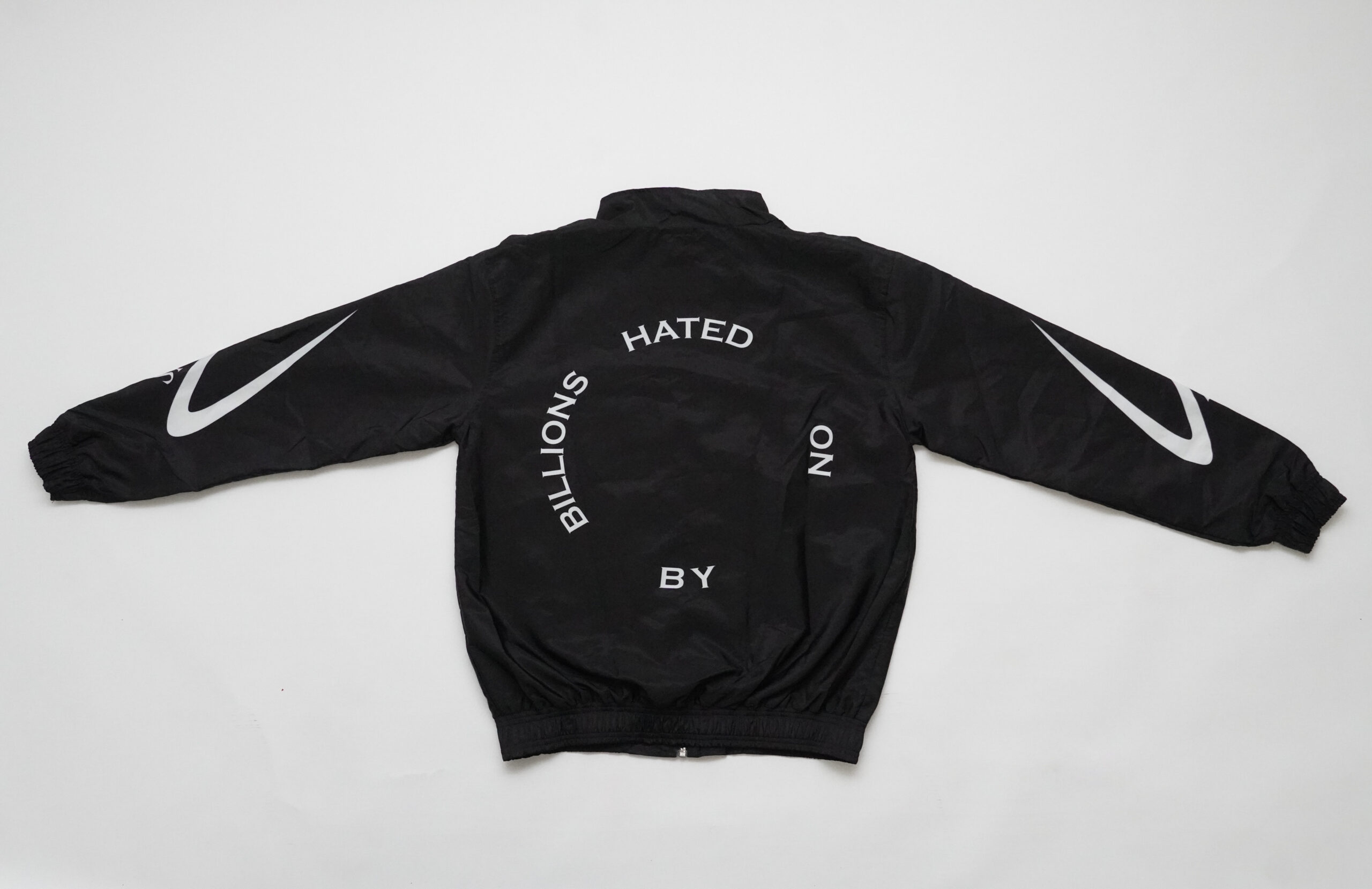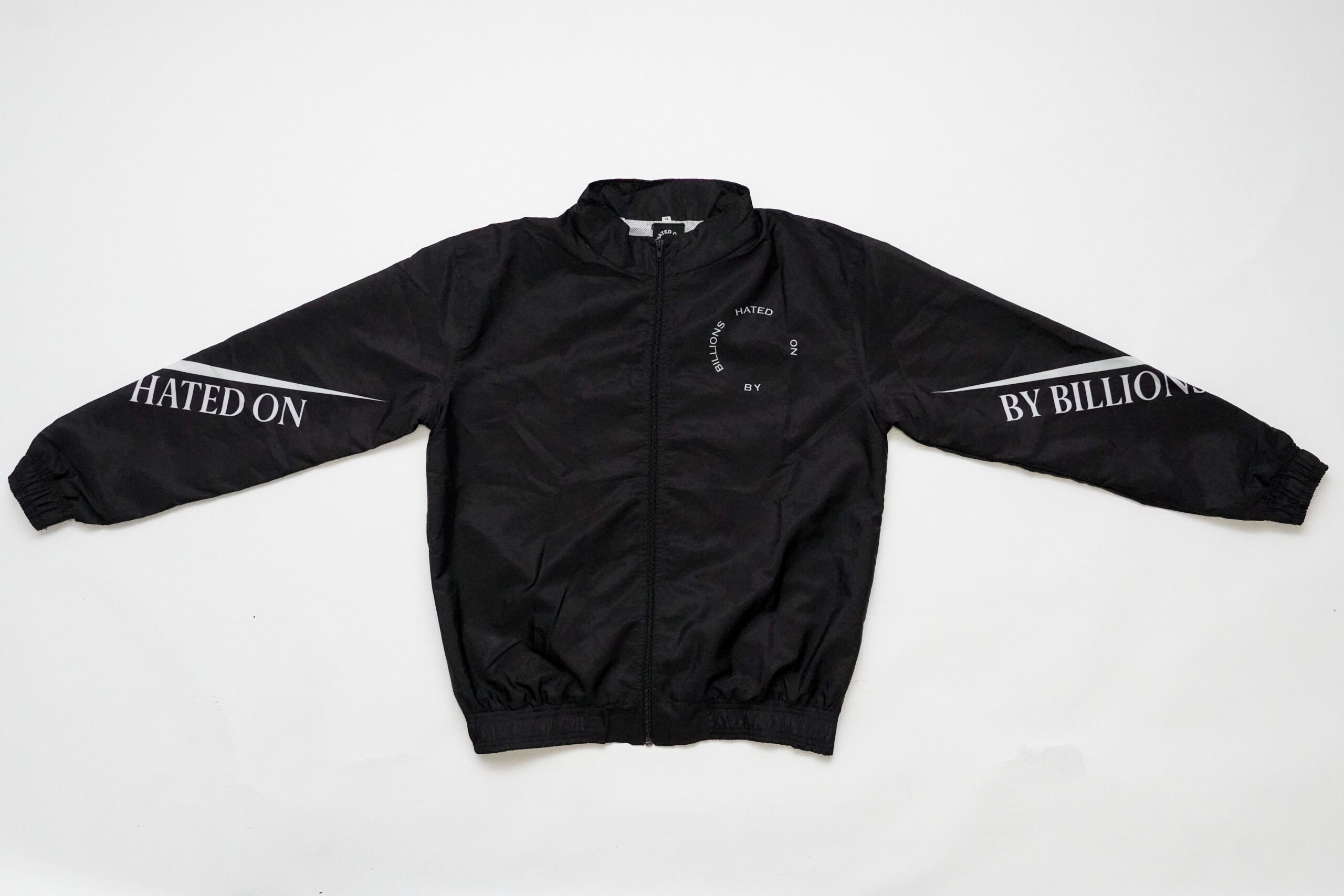 Lightweight and bold, this black zip‑up track jacket features “HATED ON” and “BY BILLIONS” text printed along the sleeves and a subtle logo on the chest. Designed with elastic cuffs and hem for a secure fit, it’s perfect for layering with a clean streetwear edge.